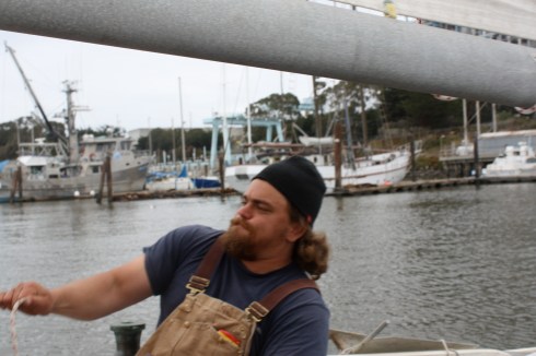 a few dock buddies and I take selene out for what would end up being her final trial in the bay before setting of on our west coast journey.  you can see me successfully raising the sails for the first time ever.  i’m sure it will not go that smoothly every time, but you gotta start somewhere.  you can also see the new cabin top i built for staying out of the weather while tending the helm.