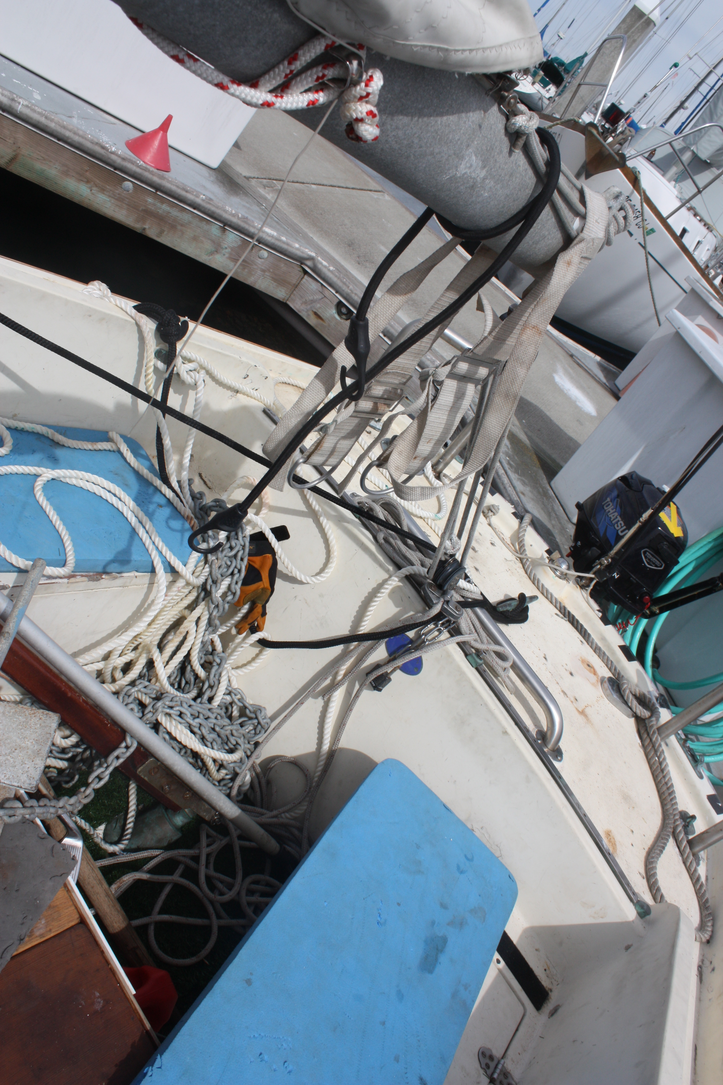 » finally made it into a slip in monterey after three long but rewarding days at anchor. the last test came with bringing in the anchor, it took 3 hours to haul. first the from the strern, nothing, then the bow, nothing, nothing and nothing, she willn’t come up. then comes the engine, we spin circles around the rhode, then warp around the winch, inch by inch, strength completely depleted, boat staying heeled over on starboard side being pulled to the depths by what i’m slowing realizing is my first anchor snag, i looked at the depth sounder, 36 feet of water, i still have out 100′ feet of rhode and 60′ of chain, yet my anchor line is coming straight up from the bottom, call the harbor get a number for a diver, i remember at one moment i thought of moses, but instead of “lord let my people go free” it was “lord let my anchor go free”, finally just before dialing up the diver, as I was sitting heeled over with the dangerously tight rhode there was big snap, i instantly felt relief cause i knew my boat was free, now i just had to find out if the snap was my gear or something else, thankfully i got all my tackle back, but barely seeing as my arms were in constant agony from fighting with the rhode, and finally i made it to the slip