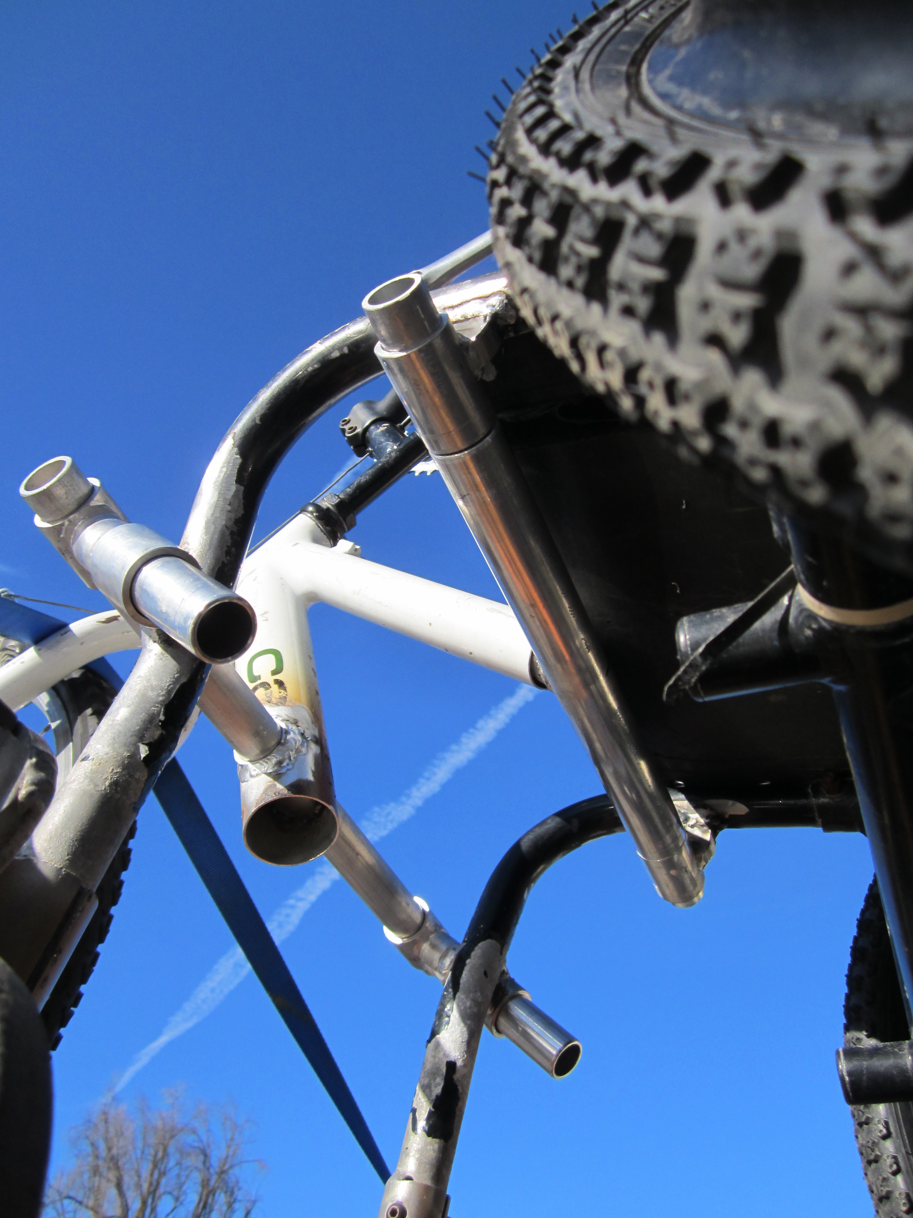 View shows attachment points, with hand cycle attached. Very important that they do not interfere with regular function of the chair. This is my full time wheelchair, with or without the hand cycle attached.