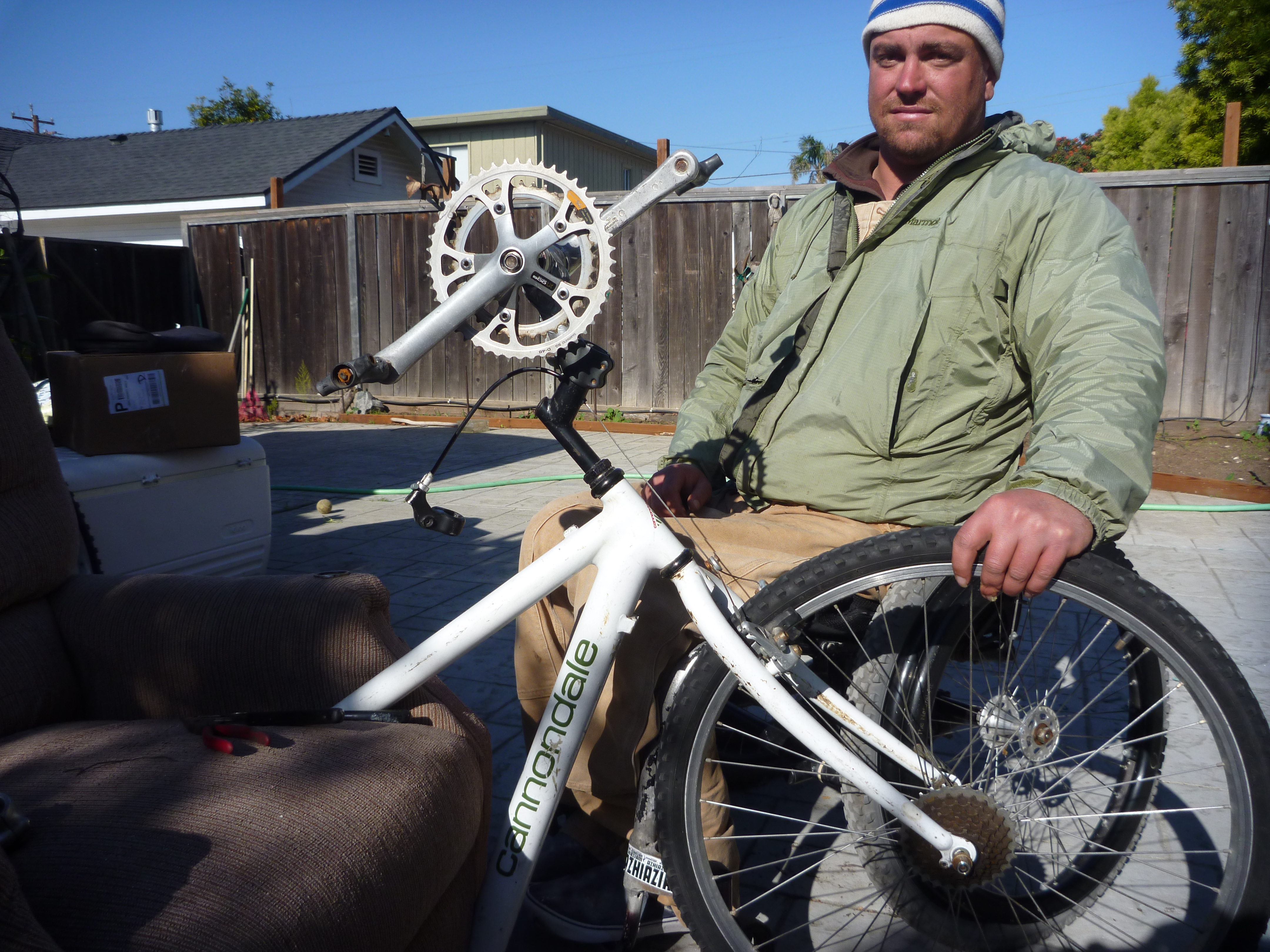 Recycled mountain bike with crankshaft replacing handle bars and rear wheel fitted into front fork.