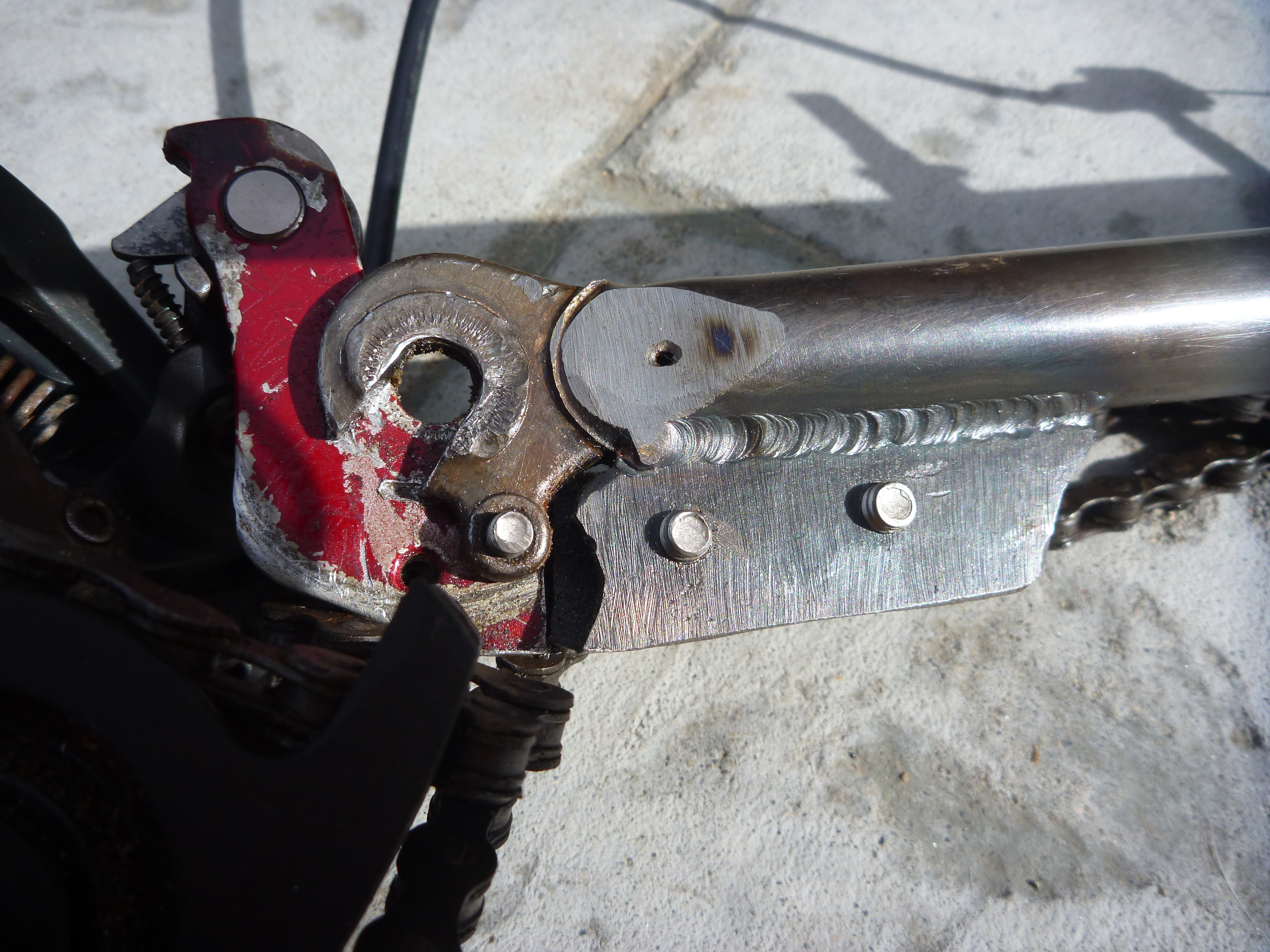 Backside of steel plate that was welded to the bicycle fork for the de-railer attachment point.